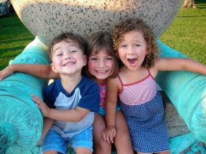 My two older children, left and right, with their best friend (and daughter of their caregiver for the evening, center) — having fun before the concert started!